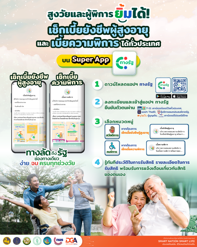 เพิ่มช่องทางในการเช็กเบี้ยยังชีพผู้สูงอายุ และ เบี้ยความพิการ บนแอปฯ ทางรัฐ ไม่ว่าคุณจะอยู่ที่ไหน เป็นคนจังหวัดอะไรในประเทศไทยก็สามารถเช็กสิทธิของตนเองง่ายๆ พร้อมรับการแจ้งเตือนเกี่ยวกับสิทธิของตนเองได้ในแอปฯ เดียว