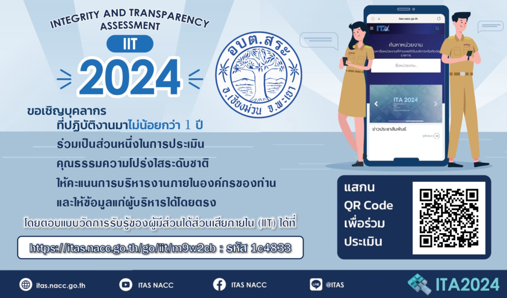ขอเชิญบุคลากรที่ปฏิบัติงานมาไม่น้อยกว่า 1 ปี ร่วมเป็นส่วนหนึ่งในการประเมินคุณธรรมความโปร่งใสระดับชาติ ให้คะแนนการบริหารงานภายในองค์กรของท่าน และให้ข้อมูลแก่ผู้บริหารได้โดยตรง ตอบแบบวัดการรับรู้ของผู้มีส่วนได้ส่วนเสียภายใน (IIT) ในการประเมินคุณธรรมและความโปร่งใสในการดำเนินงานของหน่วยงานภาครัฐ ประจำปีงบประมาณ พ.ศ.2567 เพื่อเก็บข้อมูลการรับรู้ของบุคลกรที่ปฏิบัติงานมาไม่น้อยกว่า 1 ปี กับองค์การบริหารส่วนตำบลสระ เพื่อนำไปแก้ไขปรับปรุง พัฒนาระบบการทำงานให้ดียิ่งขึ้น ต่อไป