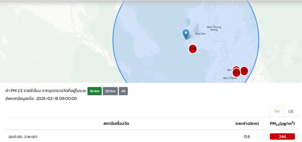 ปริมาณค่าฝุ่น PM 2.5 จัดวัด ณ อบต.สระ เวลา 09.00 น. วันที่ 18 ก.พ. 2568 ปริมาณเท่ากับ 244 ไมโครกรัมต่อลูกบาศก์เมตร มีผลกระทบต่อสุขภาพเป็นอย่างมาก